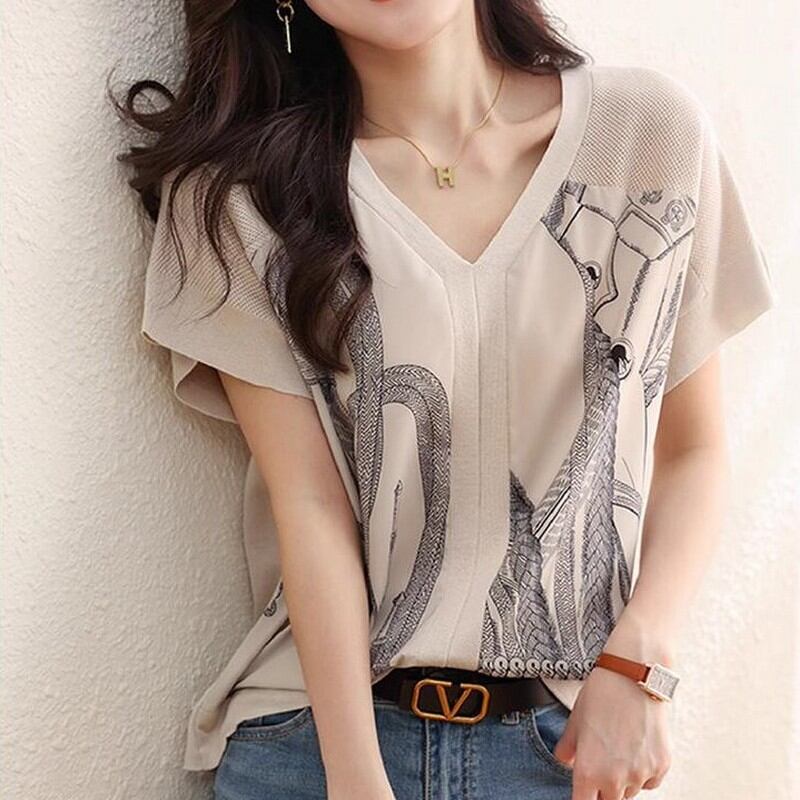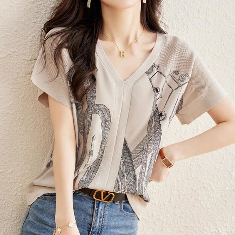 異素材ミックスVネック半袖柄トップス M00098
