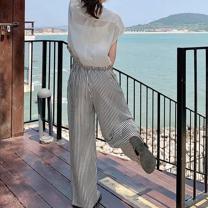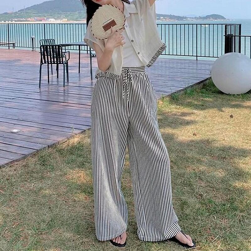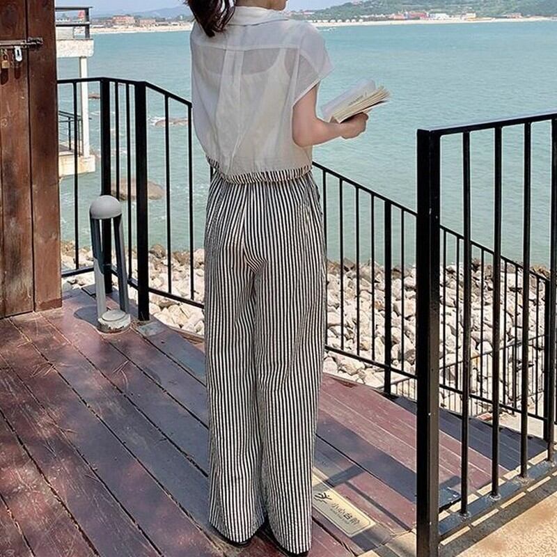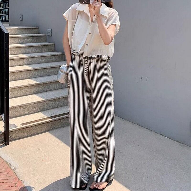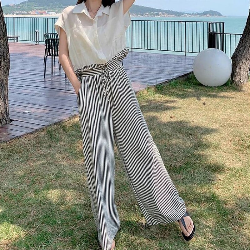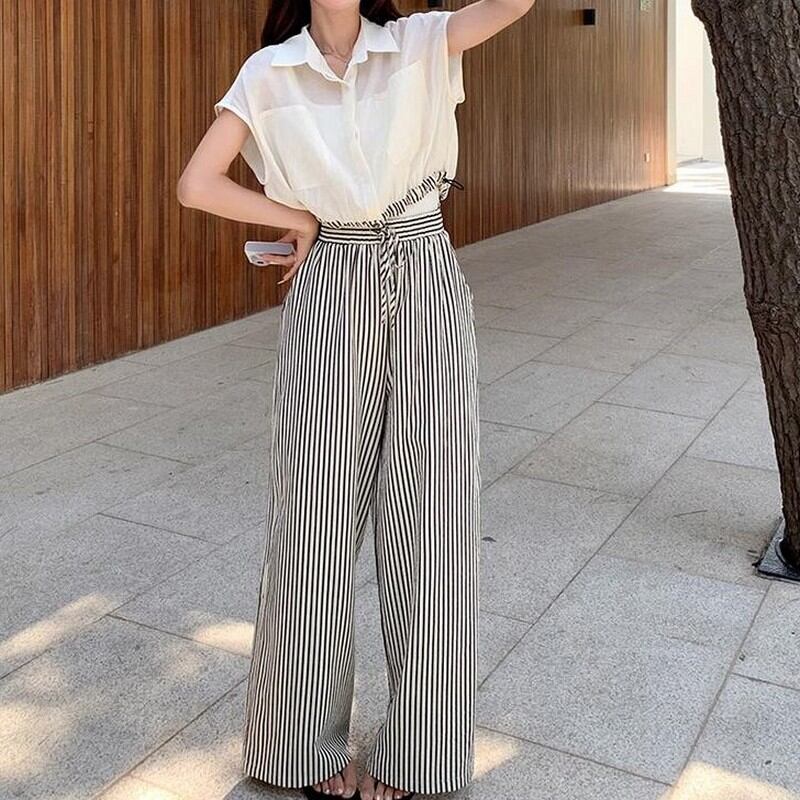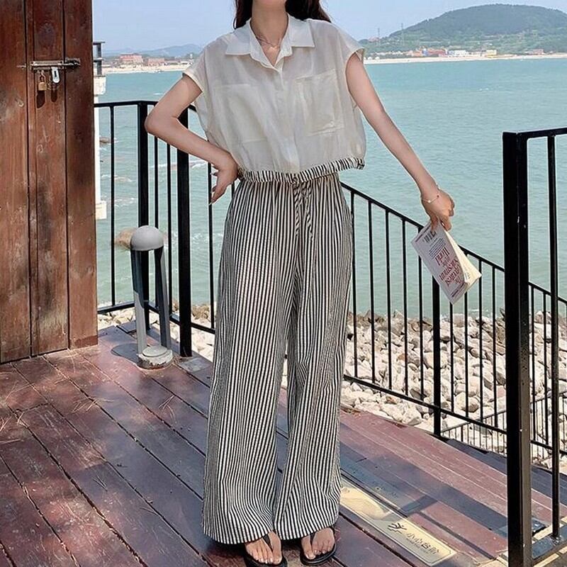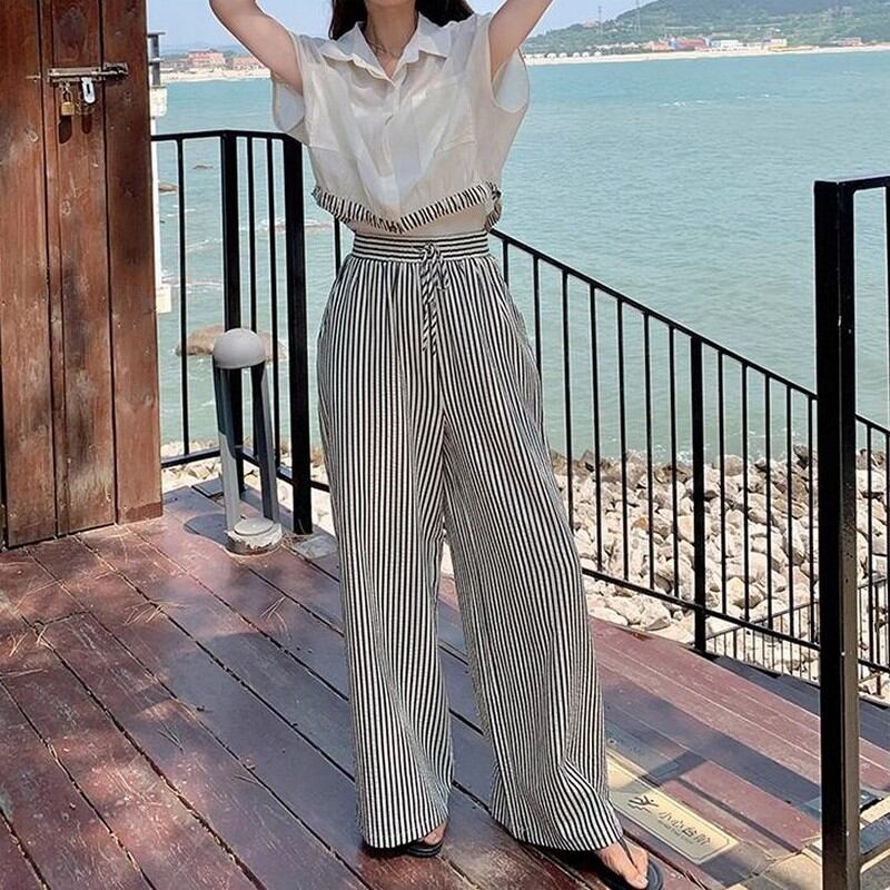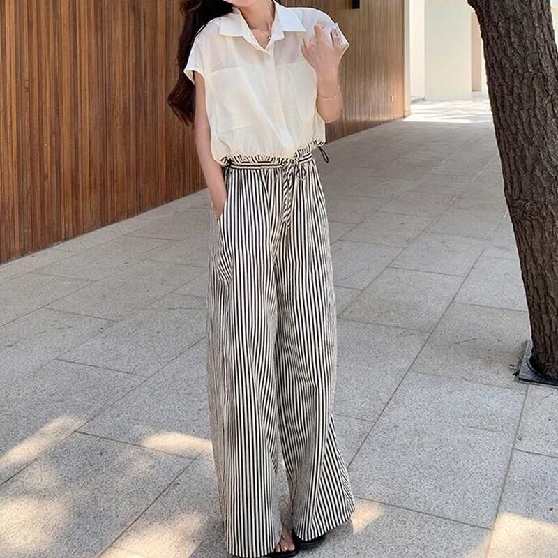 半袖シャツ×ストライプワイドパンツ2点セット M00077